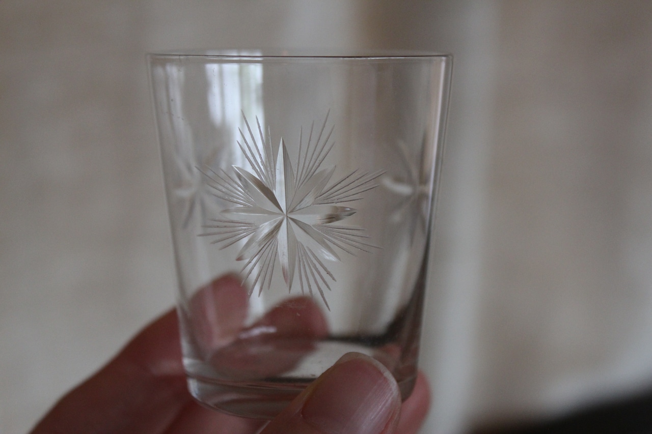 コップは薄手、一周に3つの星のカットが施され大胆な模様にキリッと鋭角なカットが美しいです。